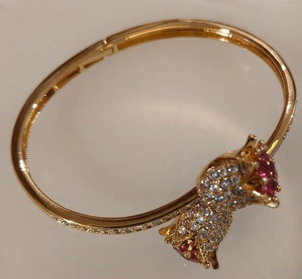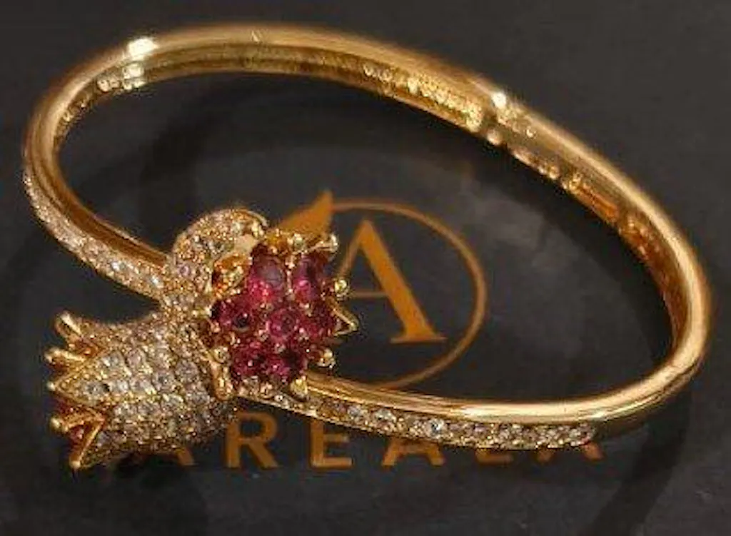 Romance meets brilliance in the Rose Zircon Bloom Bracelet — a stunning piece adorned with two opulent rose blooms encrusted in shimmering stones and set with radiant red zircon centers. Crafted with meticulous detail, the bracelet’s curved band is fully studded with sparkling crystals, creating a dazzling statement of elegance and sophistication. Available in both silver and gold finishes, this anti-tarnish designer piece embodies grace and glamour, perfect for evening wear or special gifting.